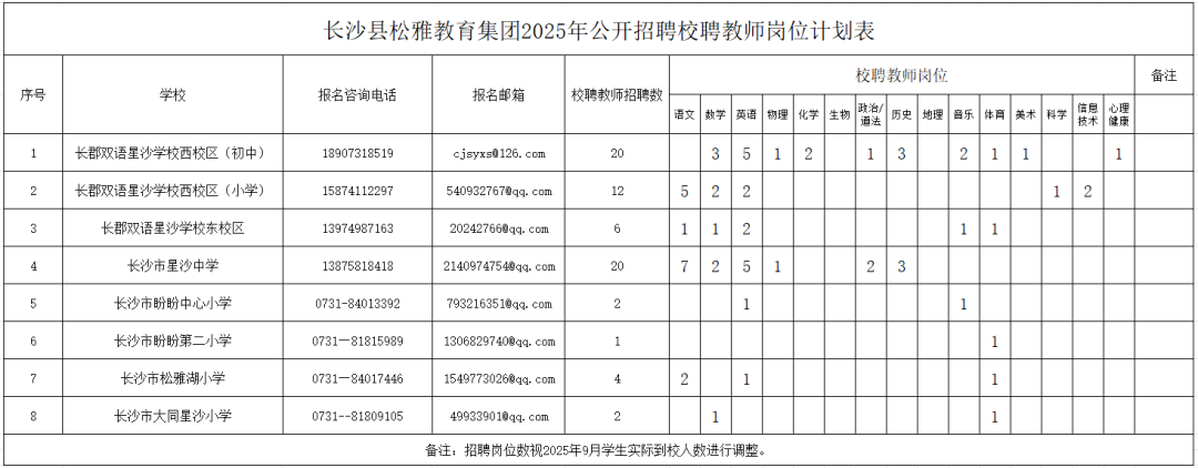 本次招聘岗位计划详见《长沙县松雅教育集团2025年公开招聘校聘教师岗位计划表》(招聘岗位数可视2025年9月学生实际到校人数进行调整)。